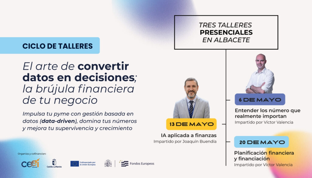 ¿Tu negocio toma decisiones con datos… o muchas veces va resolviendo sobre la marcha? Hoy tener una visión clara de los números es clave. Y si además sabes cómo aplicar la inteligencia artificial con sentido, el margen de mejora es todavía mayor. Este mes de mayo, CEEI Albacete organiza el ciclo de talleres “El arte de convertir datos en decisiones: